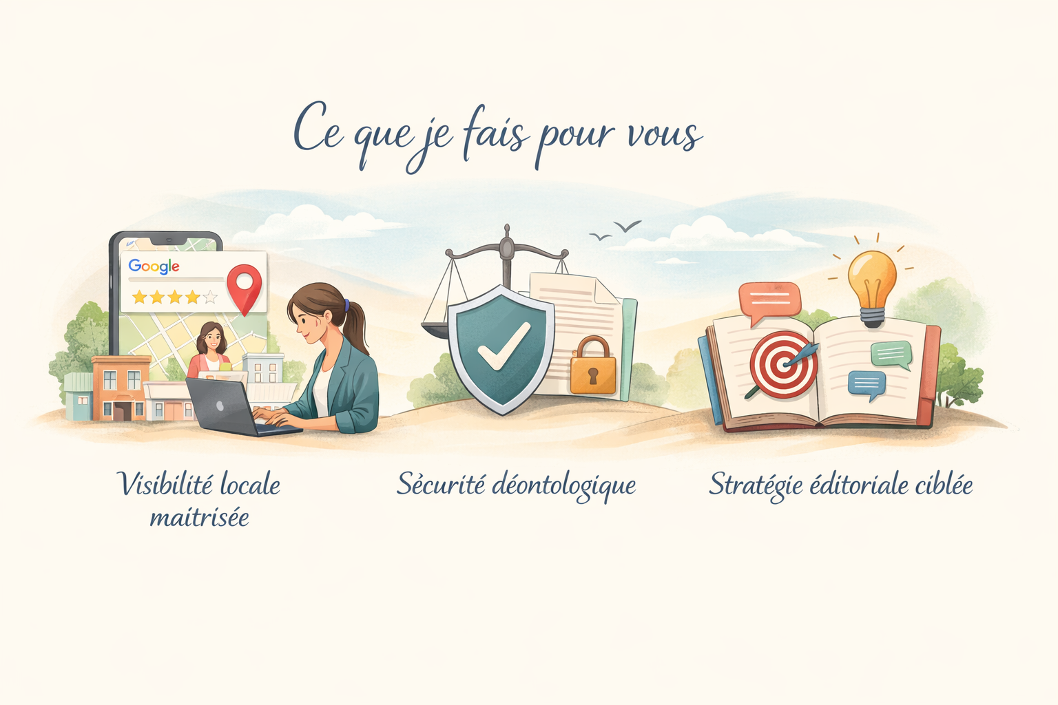 Cette stratégie est déployée de manière progressive et encadrée, avec pour objectif de renforcer la lisibilité et la crédibilité de votre présence en ligne, sans jamais altérer votre posture professionnelle.